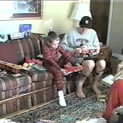 A boy opens Christmas Presents. He opens a box of "Eye Pads". His father laughs off camera. The Boy is not happy.