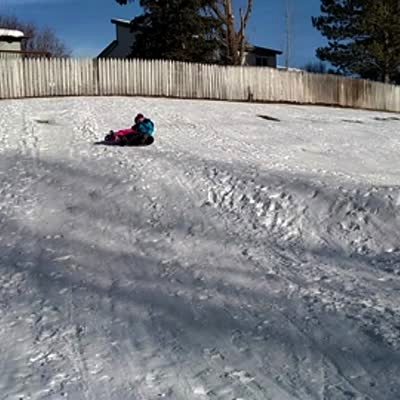 A young boy and girl ride an inflatable tube down a snow covered hill. They hit a large pad and the boy bounces over the pad and lands on the sidewalk on the other side or the pad.
