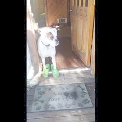 A boxer dog puts his feet in a pair of Crocs shoes and walks outdoors.