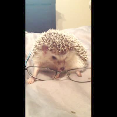 A hedgehog bites at a pair of glasses on a bed indoors and briefly manages to get them on her face.