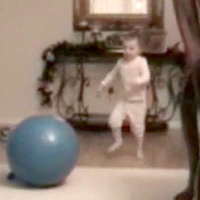 Tot girl in pink pajamas runs for toys on Christmas morning & flips over a big bouncy ball.