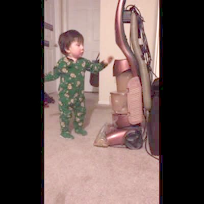 A tot boy indoors hits a vacuum cleaner and runs away screaming when it turns on.