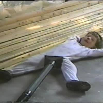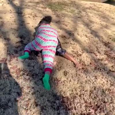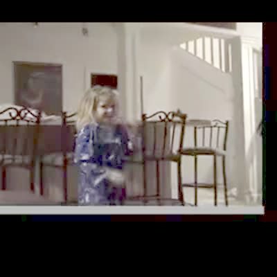 A young girl dances in the living room. Her brother suddenly falls off a couch and kicks her in the face and they both fall. Music rights not cleared.