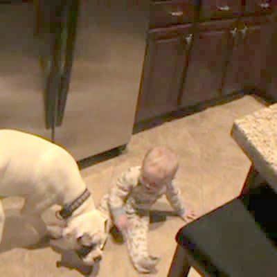 Dog drags a laughing baby around the kitchen floor.