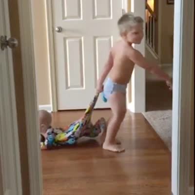 A tot boy drags his baby brother along the floor by the leg of his pajamas indoors.