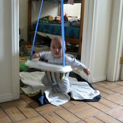 Baby boy in jumper "freezes" when woman says "FREEZE!" Baby is wearing footed pajamas.