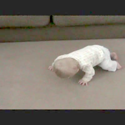 Tot girl wearing pajamas crawls across the living room floor, leans down to pick up a piece of cereal with her mouth and it sticks to her forehead.