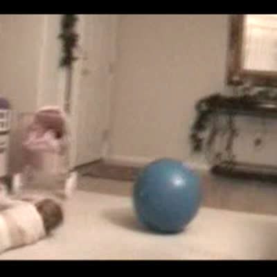 Tot girl gets hit in the head with an exercise yoga ball while she stands and picks her nose. short tail