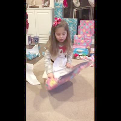 A young girl opens her Christmas gift and says she always wanted it but doesn't know what it is.