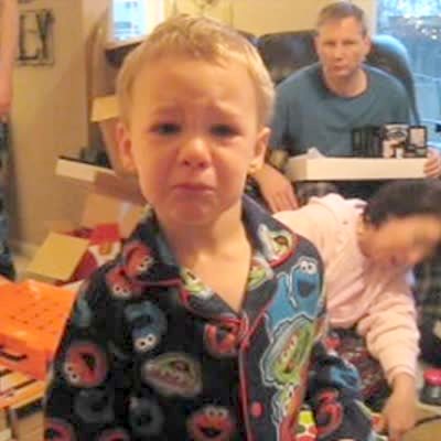 A tot boy in pajamas cries on Christmas morning because Santa ate his cookies.