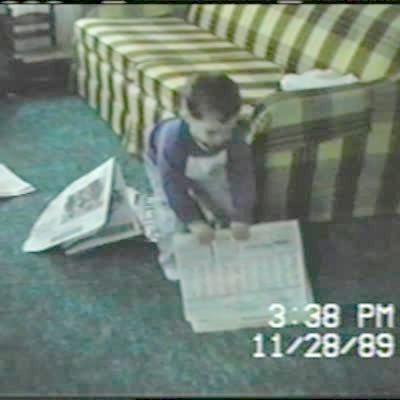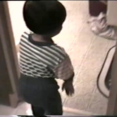 A tot boy sticks his hand in his pants in the kitchen and the man with the camera asks him what is in there. The boy says "a tape measurer" and then pulls the tape out from his pants and extends it up.