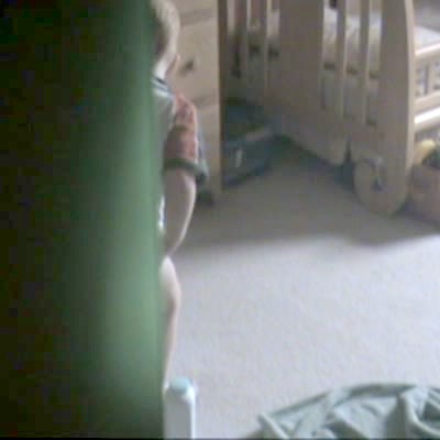 Young boy sleeps in his cribs & mom pulls several toy trains from down the front of the boy's pants.