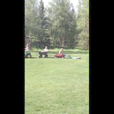 A young boy holds onto the back of a wagon attached to a tractor as it drags him and a dog pulls his pants off.