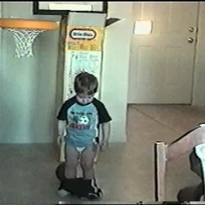 "Embarrassed B-Baller" Tot boy is playing basketball indoors on new toy basketball hoop. When he shoots the ball his dad pulls down his pants. Tot boy shakes his head "no" at dad then starts to laugh