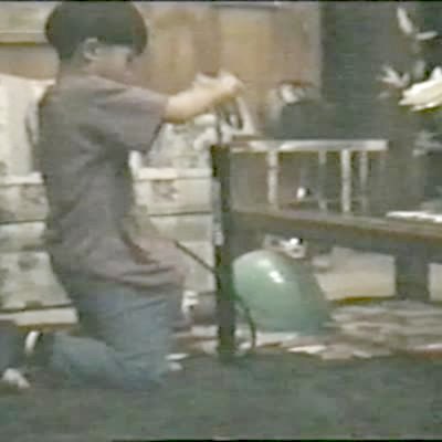 "Pop Go My Trousers" Boy blows balloon up in pants with bike pump. Balloon bursts, boy screams and pulls down pants.