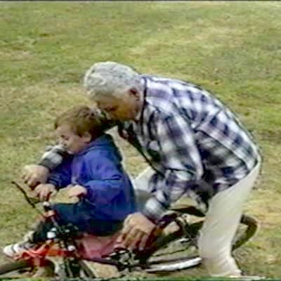Grandpa / senior man on bike with little boy falls, grandpa's long underwear pants catch on the bike and are pulled down. Good recovery