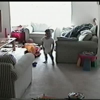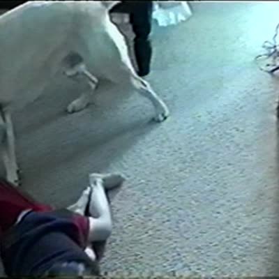 Tot boy has both legs in 1 pant leg and gets pulled around the house by a dog.