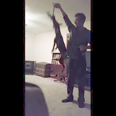 A Bull Terrier dog chases a man around at home and pulls his pants down.