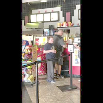 A teen boy pulls down his father's pants at a movie theater as he buys snacks.