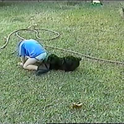 A woman pours a cup of water on the floor and challenges her son to try to mark her hand before she can wipe up the puddle of water. She counts to three but instead of wiping it up, she pulls him into the puddle to get the seat of his pants wet. Practical joke.