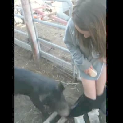 A woman tries to run on a treadmill as a teen girl speeds it up and the woman slips and is dragged down. While on her stomach her pants are pulled down around her legs.
