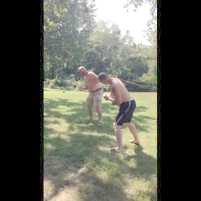 Two men wear pantyhose on their heads with a ball in the foot of each pair and they swing them around outdoors until one of them hits the other in the groin.