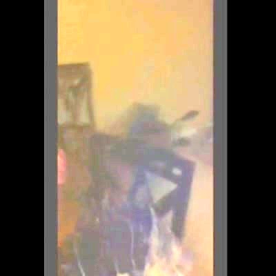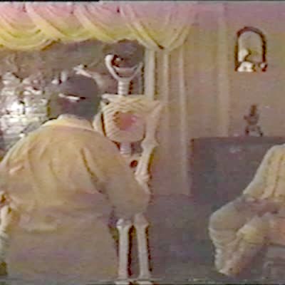 Man tries to catch a lit cigarette in his mouth in the dining room, woman sprays him with fire extinguisher. Practical joke.