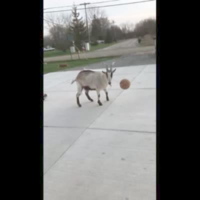 A teen boy throws a basketball to a goat in the driveway and the goat headbutts the ball back to the boy and it hits him in the groin.