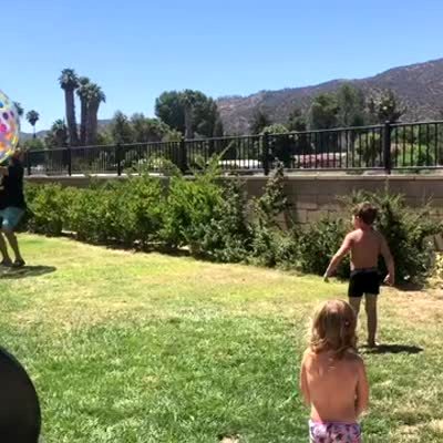 A man throws an inflated ball at a young boy in a yard and it hits the boy in the face and knocks him down.