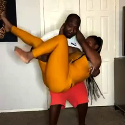 A woman and man film themselves doing a trick in home and woman accidentally passes gas and the man drops her to the floor.