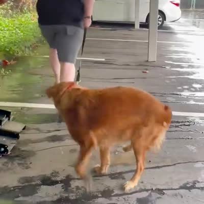 In an attempt to avoid the rain, a man with his dog on a leash tries to run from the carport in a parking lot. The leash is caught by a pillar and the force pulls the man to the ground.