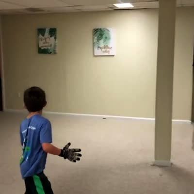 A young boy runs in slow motion in a furnished basement and another boy throws a football to him. The ball hits the boy in the face, but he catches the ball as he falls on the floor.