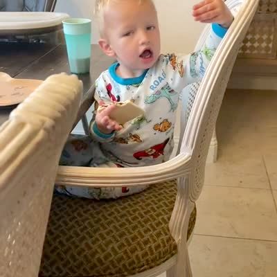 A woman tells a tot boy that his food is in his hand in a dining room, but he passes it from hand to hand and looks at the empty hand.