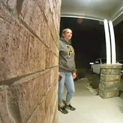 A woman steps outside to a front porch to pass gas, and then realizes there is a ring camera, and laughs. Security Footage