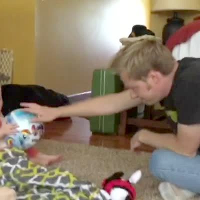 A baby girl cries repeatedly when her father passes a ball to her in the house.