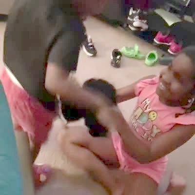 A tot boy passes a woman's wig to his older sister and calls it a puppy.