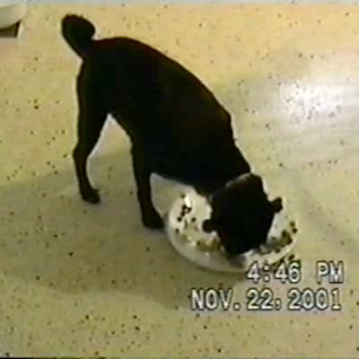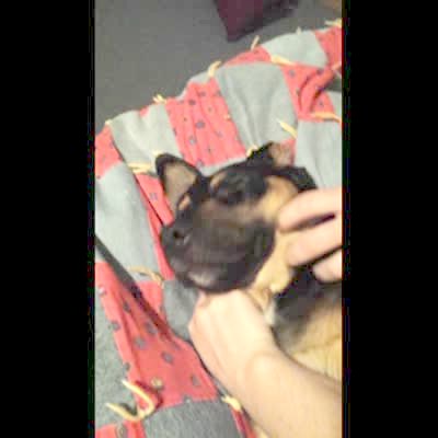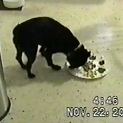 Little black dog gets plate of food for Thanksgiving, then is passed out on couch with tongue sticking out.