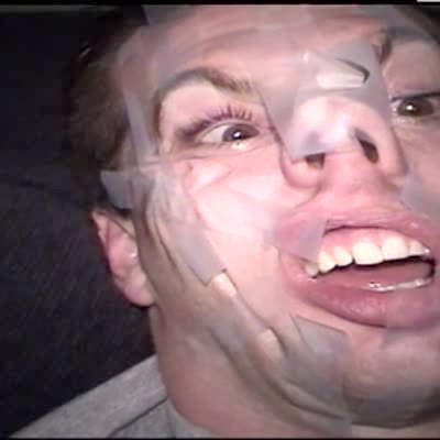 "While You Were Sleeping" Drunk man is passed out. Friend has taped his entire face so his eyes are open and so is his mouth. He never wakes up. Sleep. College