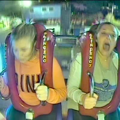 "Passed Out Passenger" Two teen girls ride slingshot ride, girl on left passes out cold (video cuts in and out. download for audio) Faint. Woman. Roller coaster.