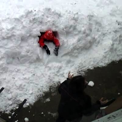 A boy pops out of a deep pile of snow to startle a woman on a sidewalk passing by.