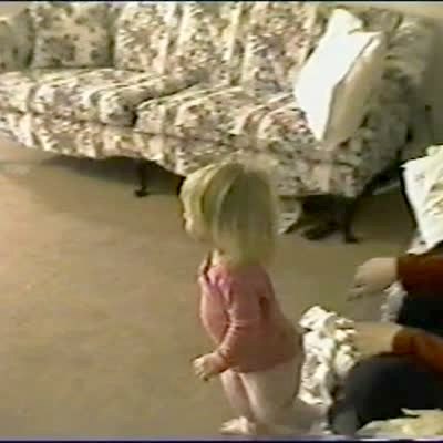 Tot girl runs to her mom. Cat hiding under the couch runs out and knocks the girl over as she passes. Cat attack.