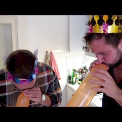 Two men try to blow up orange tube balloons in kitchen at party, one man faints and falls back into door, men laugh and hug.