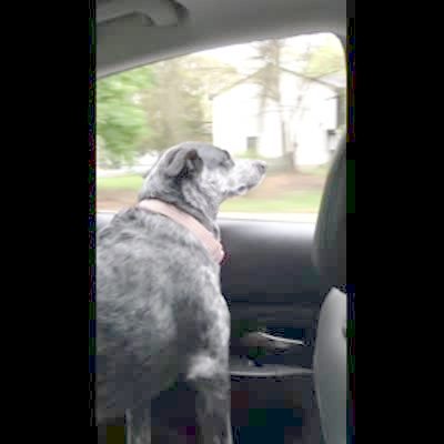 A dog bites at passing cars as she rides in a moving car and holds her head out the window.
