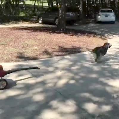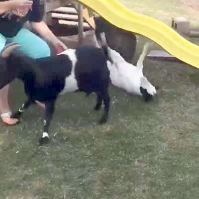 Two goats corn from a large bag in a golf cart. A woman sneaks up on them and screams. The goats jump awkwardly out of the cart and faint, then eventually come to and walk away.
