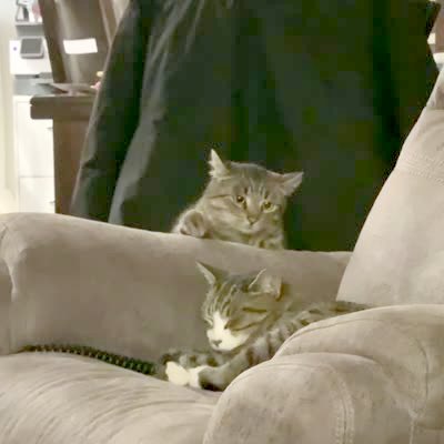 A cat sleeps on the couch and another cat peeks over the edge. The sleeping cat wakes up, and the other cat slowly dips back down and out of sight.