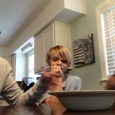 "Pregnancy Pass Out" Two women and a man pose for a picture at home. Instead of saying "cheese" one of the women says, "I'm pregnant!" and the other one passes out, faints. Mother, mother-in-law.