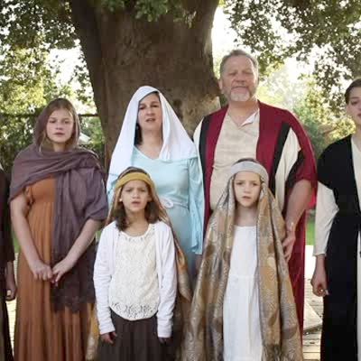 A family sings a church song with costumes in the yard, and when one young girl faints the family turns to look at her. A man and woman bend over to help the girl, and another young girl trips and falls over them on the ground.