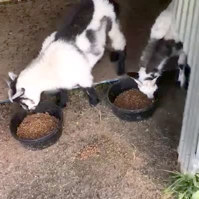 Two goats eat food on a farm and simultaneously faint when a person walks up to them.