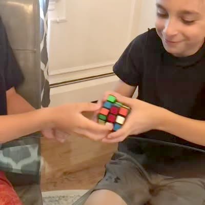 Three young boys take turns on an incomplete Rubik's cube. They then pass it to another young boy, who puts it in a bag, snaps his fingers, and pulls out two complete Rubik's cubes. He then crumples the bag and throws it behind him.