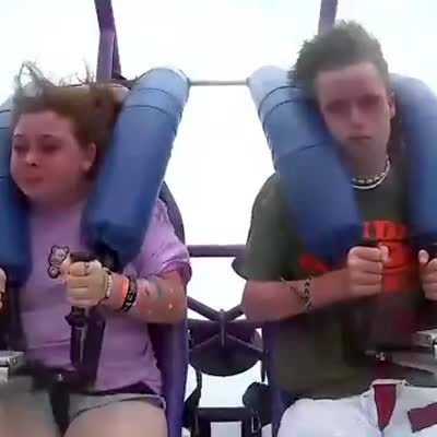 A teen boy and teen girl are on a slingshot ride and the girl gives the peace sign and says "deuces," and then the ride tils back and the girl says "hold my hand," and the boy says "no," and the ride slings up and the girl passes out for a moment and the boy says "that's awesome," and the girl passes out again and her arms go everywhere and then the girl wakes up and screams for a moment and then passes out again and then the girl wakes up and says "I'm not doing that again!"